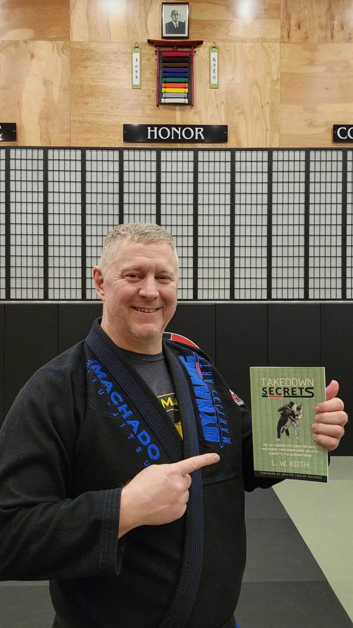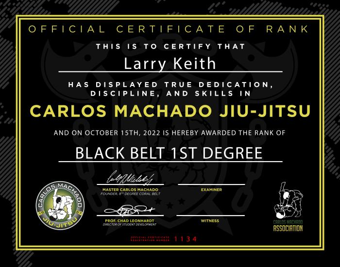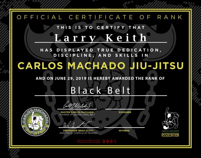 Lineage: For Jiu-jitsu -- Jigoro Kano → Tomita Tsunejiro → Mitsuyo "Count Koma" Maeda → Carlos Gracie Sr. and Helio Gracie → Carlos "Carlinhos" Gracie Jr. and Rolls Gracie → Carlos Machado → Larry Keith For Kodokan Judo -- Jigoro Kano → Kazuzo Kudo → Yuzo Kato → Larry Keith