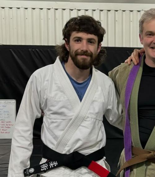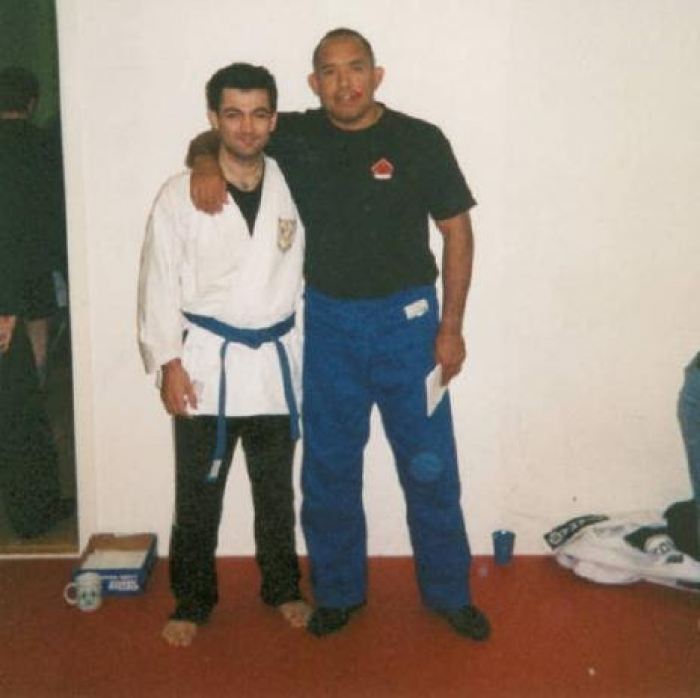 My first meeting with a Jiujitsu black belt: Mr Roy Harris. Wearing my karate blue belt and a judo jacket I had borrowed. (2003?)